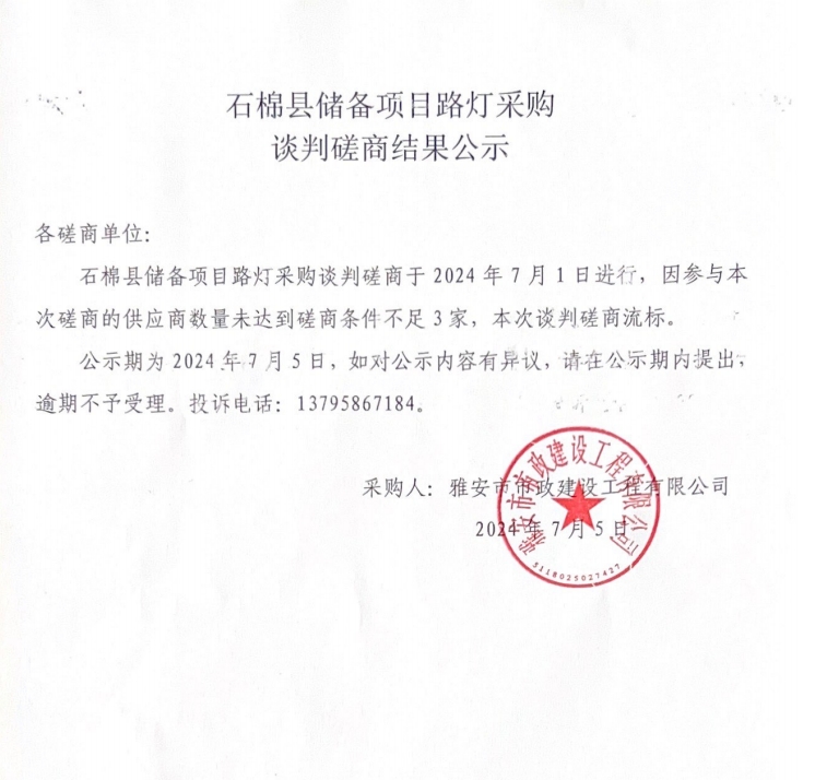石棉縣儲(chǔ)備項(xiàng)目路燈采購(gòu)談判磋商結(jié)果公示