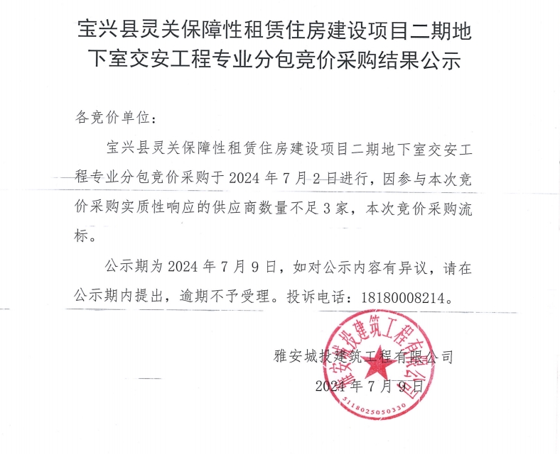 寶興縣靈關保障性租賃住房建設項目二期地下室交安工程專業(yè)分包競價采購結果公示