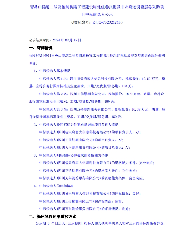 青鼻山隧道二號及附屬橋梁工程建設(shè)用地組卷報批及非農(nóng)痕跡調(diào)查服務(wù)采購項目中標候選人公示