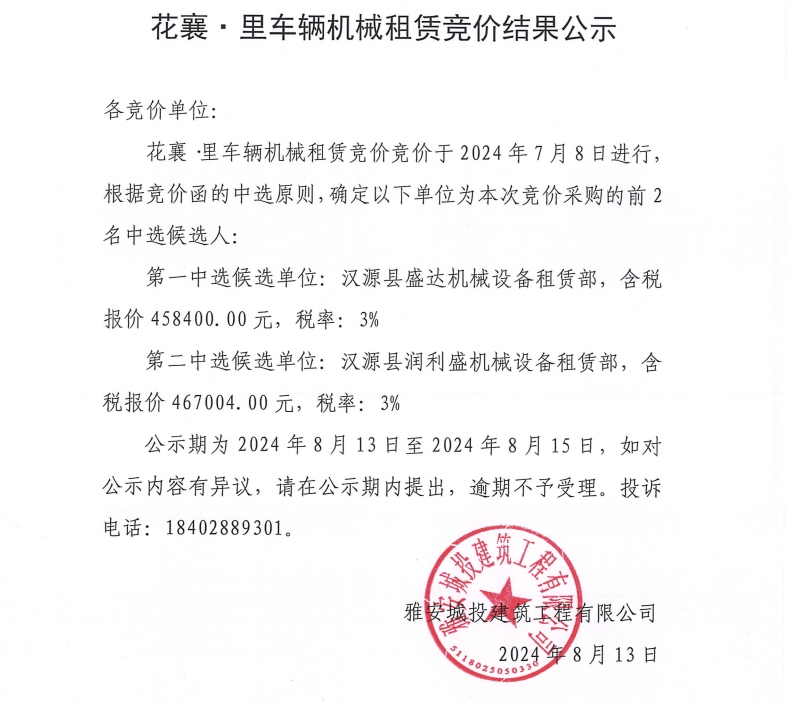 花襄·里項(xiàng)目車輛機(jī)械租賃競(jìng)價(jià)結(jié)果公示