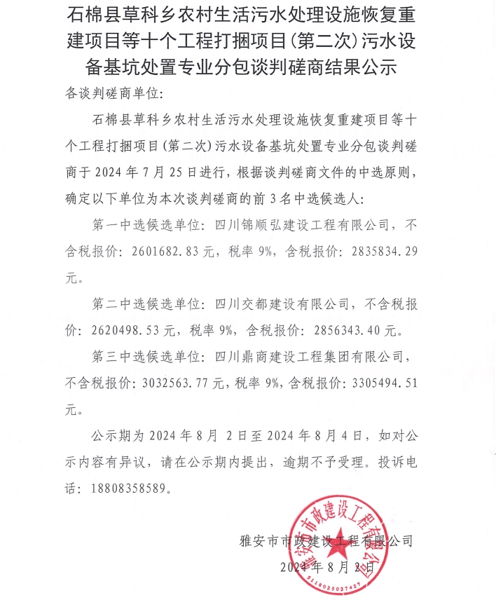 石棉縣草科鄉(xiāng)農(nóng)村生活污水處理設施恢復重建項目等十個工程打捆項目(第二次) 污水設備基坑處置專業(yè)分包談判磋商結果公示