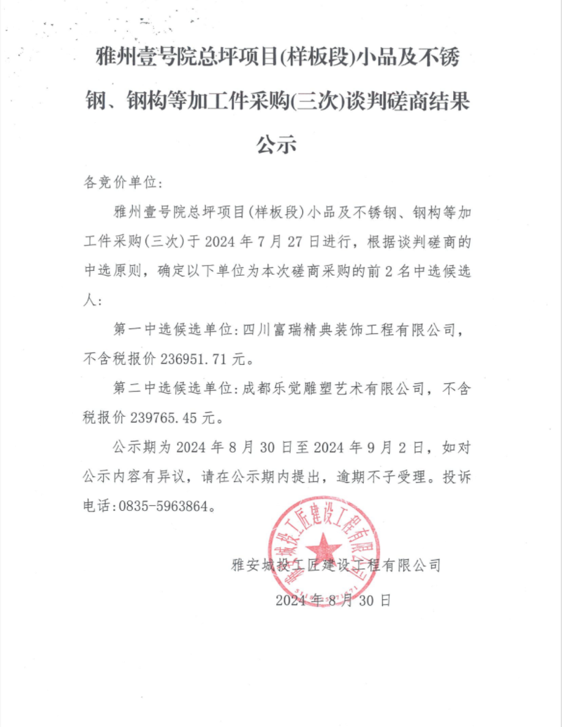 雅州壹號(hào)院總坪項(xiàng)目(樣板段)小品及不銹鋼、鋼構(gòu)等加工件采購(gòu)(三次)談判磋商結(jié)果公示