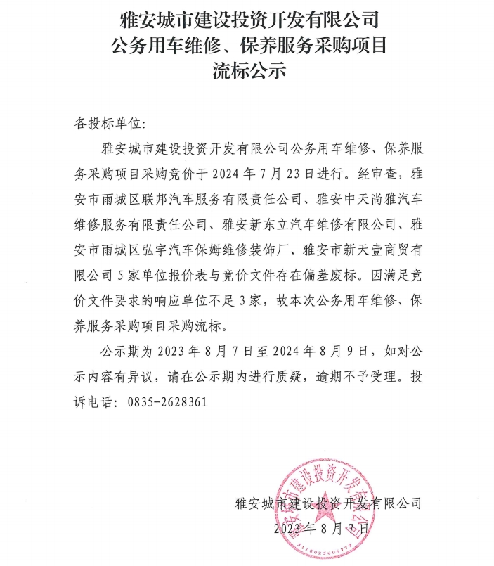 雅安城市建設(shè)投資開(kāi)發(fā)有限公司公務(wù)用車(chē)維修、保養(yǎng)服務(wù)采購(gòu)項(xiàng)目流標(biāo)公示