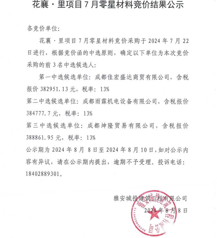 花襄·里項(xiàng)目7月零星材料競價結(jié)果公示