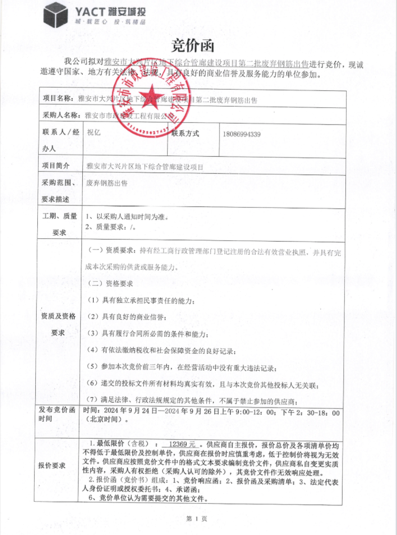 雅安市大興片區(qū)地下綜合管廊建設(shè)項(xiàng)目第二批廢棄鋼筋出售競(jìng)價(jià)公告