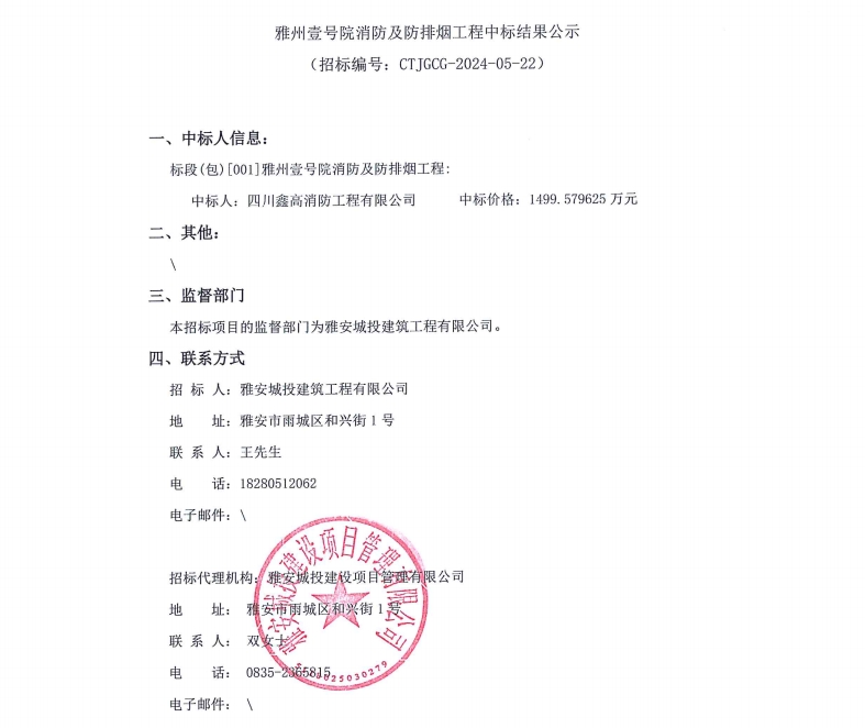 雅州壹號院消防及防排煙工程中標(biāo)結(jié)果公示