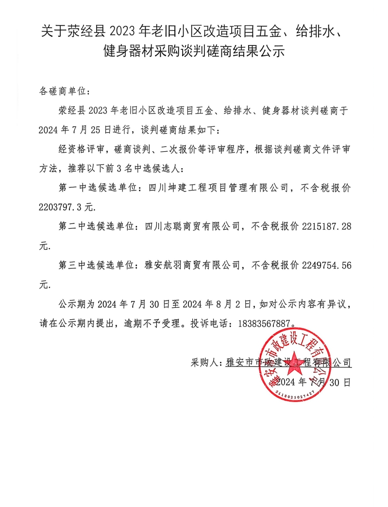 關(guān)于滎經(jīng)縣2023年老舊小區(qū)改造項(xiàng)目五金、給排水、健身器材采購談判磋商結(jié)果公示
