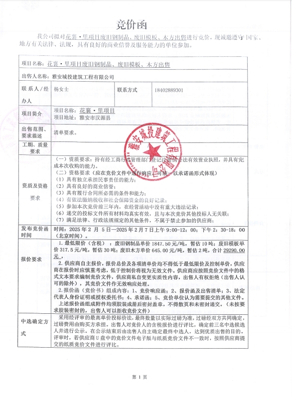 花襄·里項(xiàng)目廢舊鋼制品、廢舊模板、 木方出售競(jìng)價(jià)函