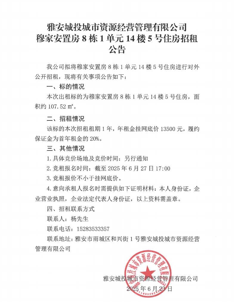 雅安城投城市資源經(jīng)營(yíng)管理有限公司穆家安置房8棟1單元14樓5號(hào)住房招租公告