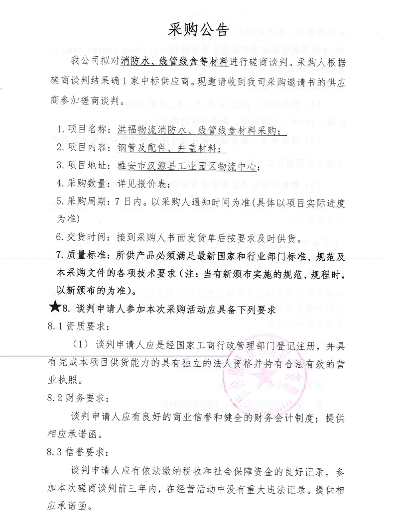 洪福物流消防水、線管線盒等材料采購公告