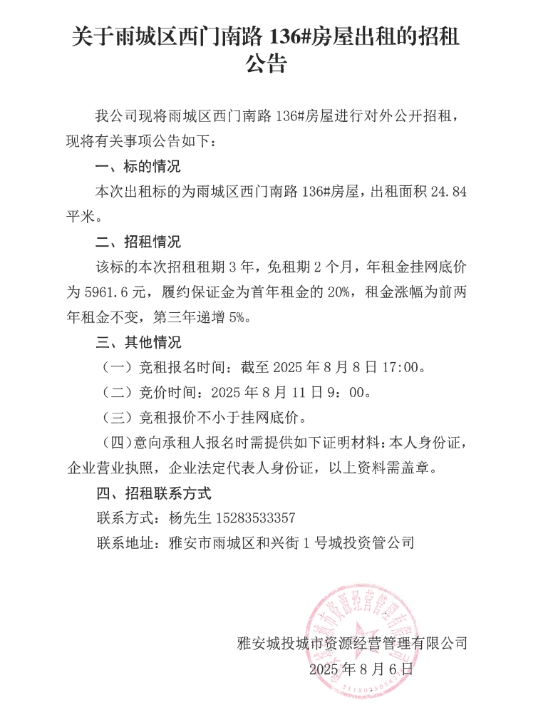 關(guān)于雨城區(qū)西門(mén)南路136#房屋出租的招租公告