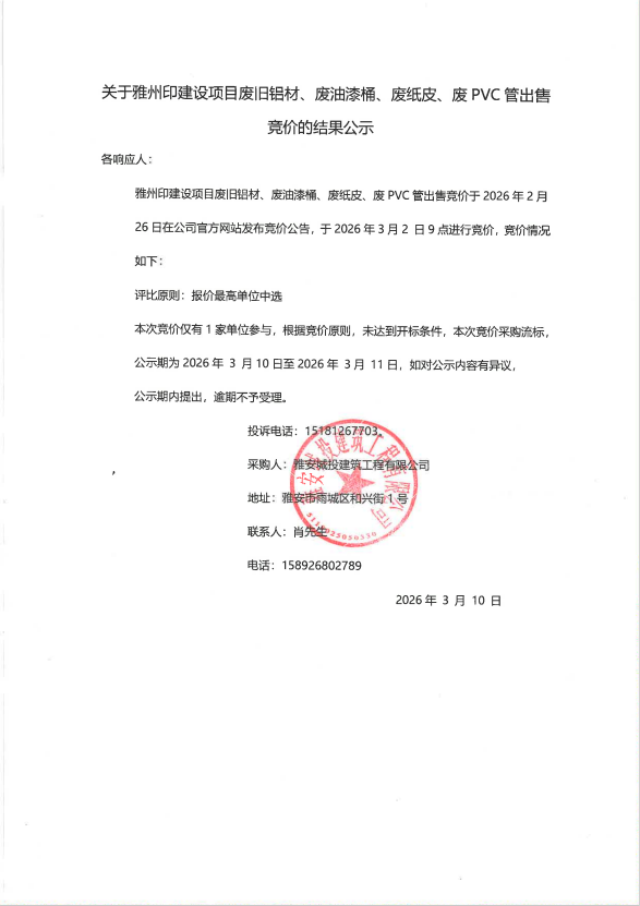關(guān)于雅州印建設(shè)項(xiàng)目廢舊鋁材、廢油漆桶、廢紙皮、廢PVC管出售競價(jià)的結(jié)果公示