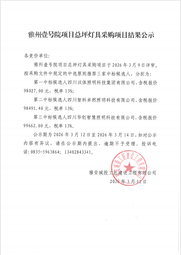 雅州壹號(hào)院項(xiàng)目總坪燈具采購項(xiàng)目結(jié)果公示