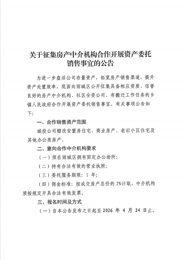關(guān)于征集房產(chǎn)中介機(jī)構(gòu)合作開(kāi)展資產(chǎn)委托銷售事宜的公告