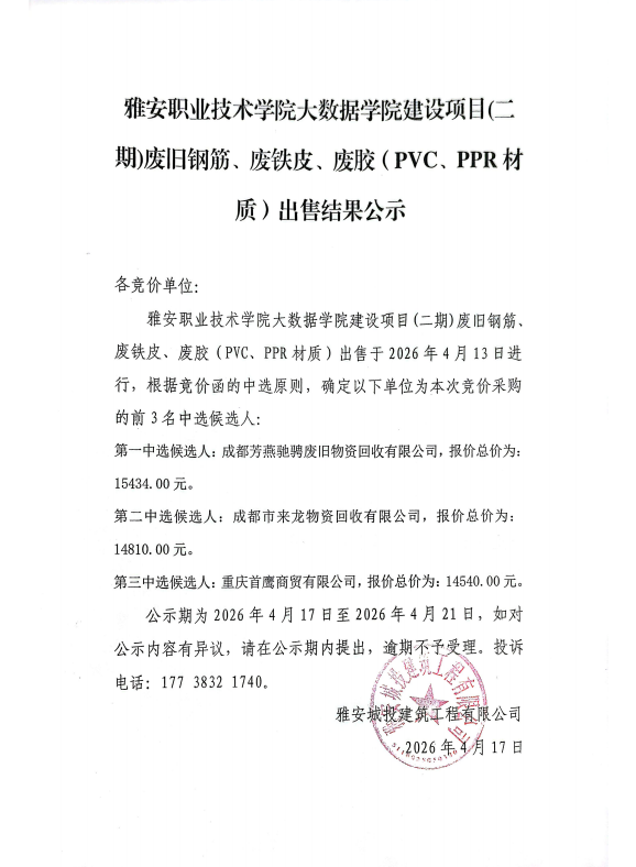 雅安職業(yè)技術(shù)學(xué)院大數(shù)據(jù)學(xué)院建設(shè)項(xiàng)目(二期)廢舊鋼筋、廢鐵皮、廢膠(PVC、PPR材質(zhì))出售結(jié)果公示