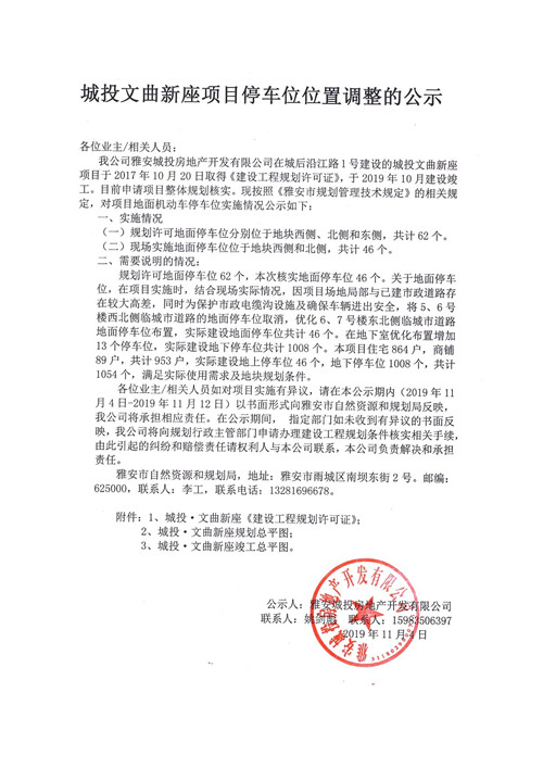 城投文曲新座項(xiàng)目停車位位置調(diào)整的公示