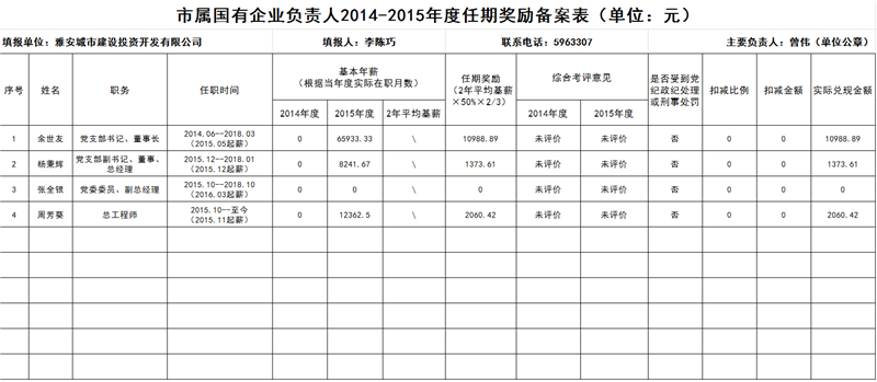 市屬國(guó)有企業(yè)負(fù)責(zé)人2014-2015年度任期獎(jiǎng)勵(lì)備案表
