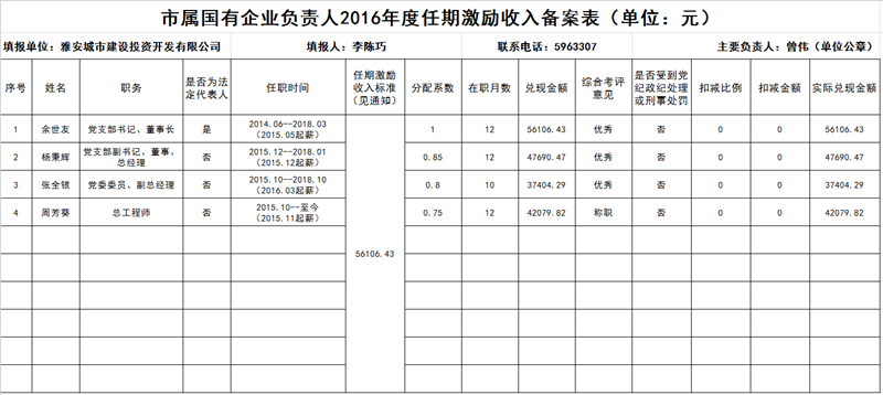 市屬?lài)?guó)有企業(yè)負(fù)責(zé)人2016年度任期激勵(lì)收入備案表