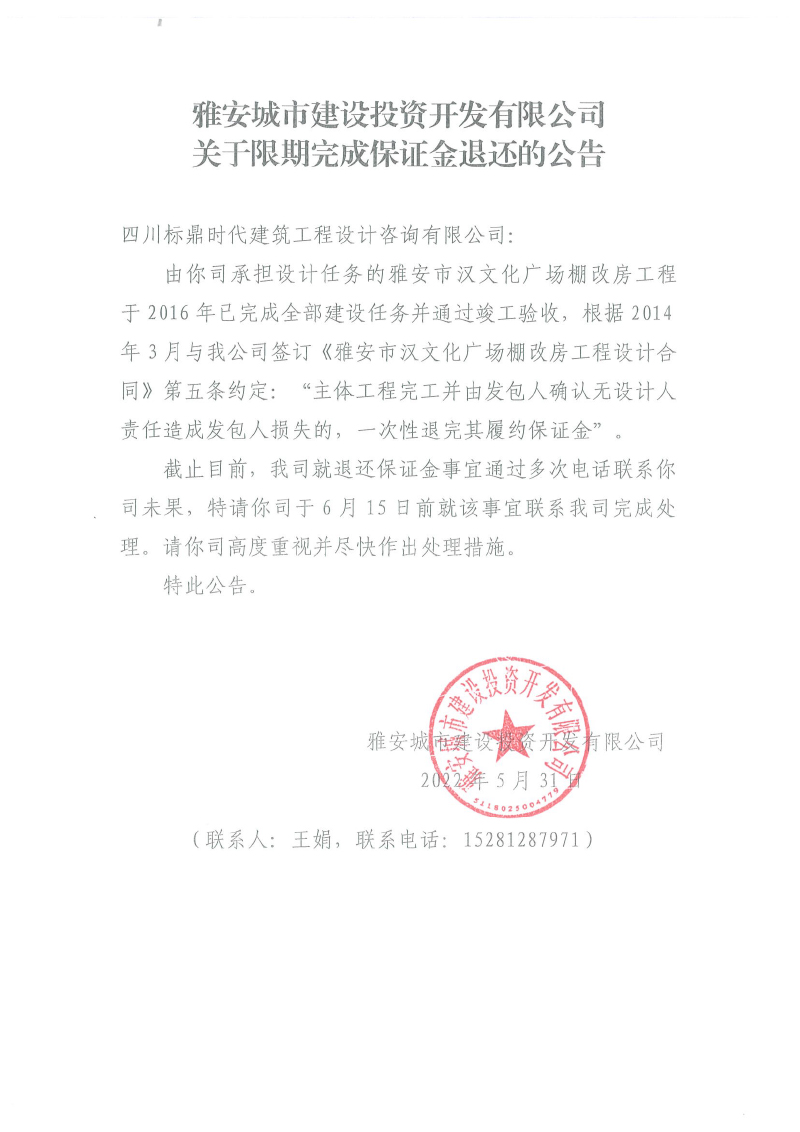 雅安城市建設(shè)投資開發(fā)有限公司關(guān)于限期完成保證金退還的公告