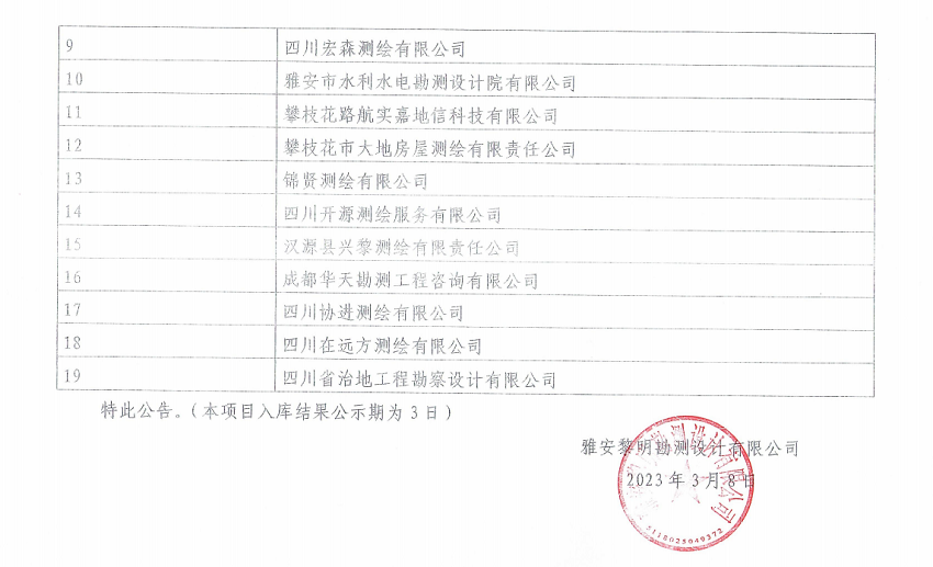 雅安黎明勘測(cè)設(shè)計(jì)有限公司測(cè)繪服務(wù)勞務(wù)單位入庫(kù)項(xiàng)目公開招募結(jié)果公示