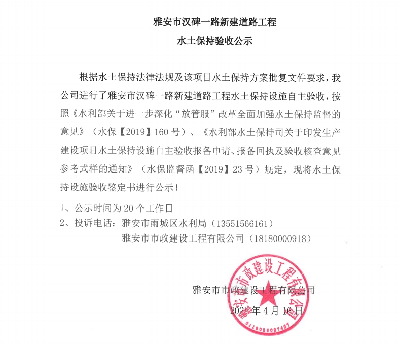 雅安市漢碑一路新建道路工程水土保持驗(yàn)收公示